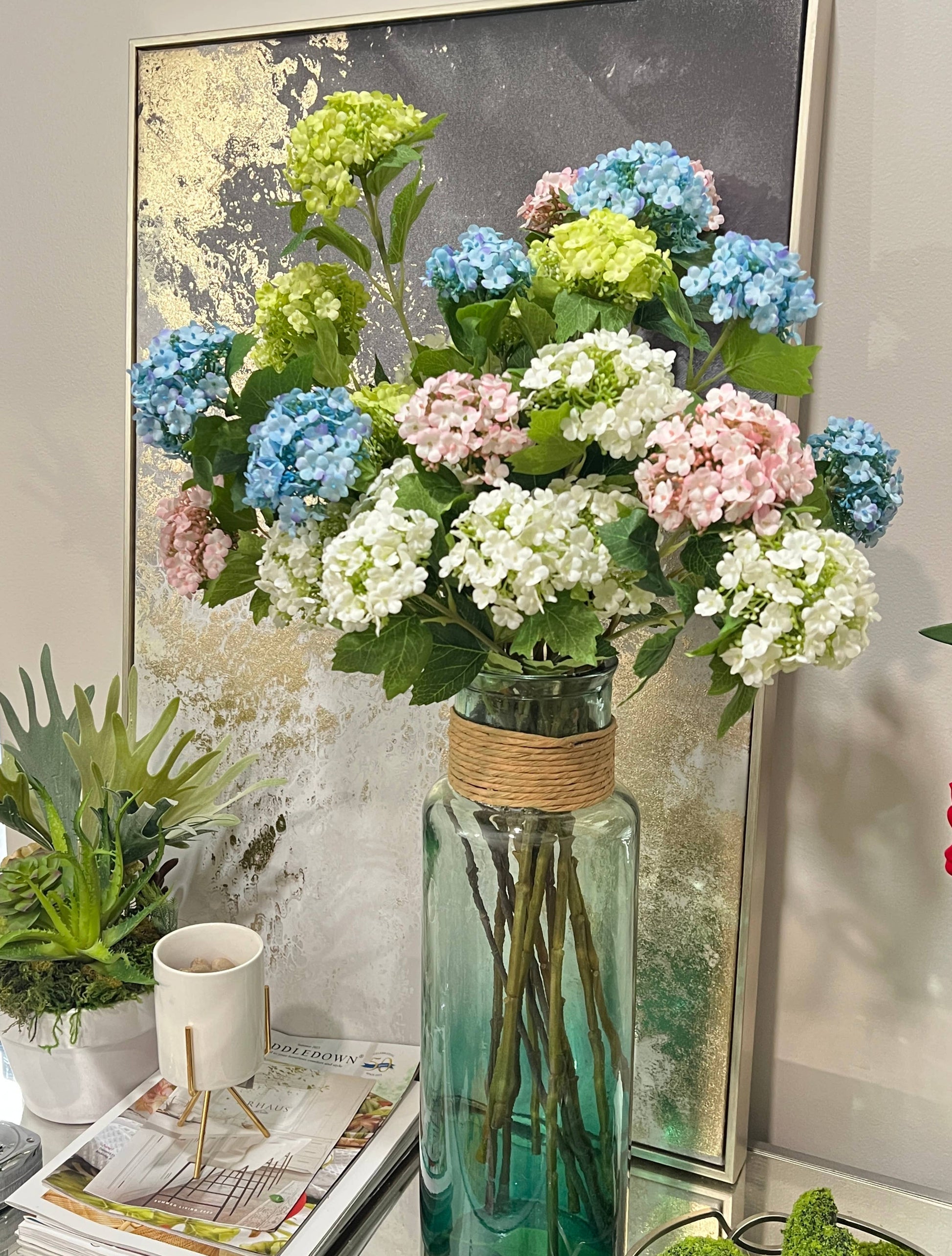 Elevate your decor with a stunning faux floral arrangement using these exceptionally beautiful snowball flowers, which rank among the finest artificial botanicals inspired by nature. Achieve a sophisticated aesthetic by artfully arranging a few branches in a large vase, allowing the heavenly hydrangea-like blooms to captivate all attention.