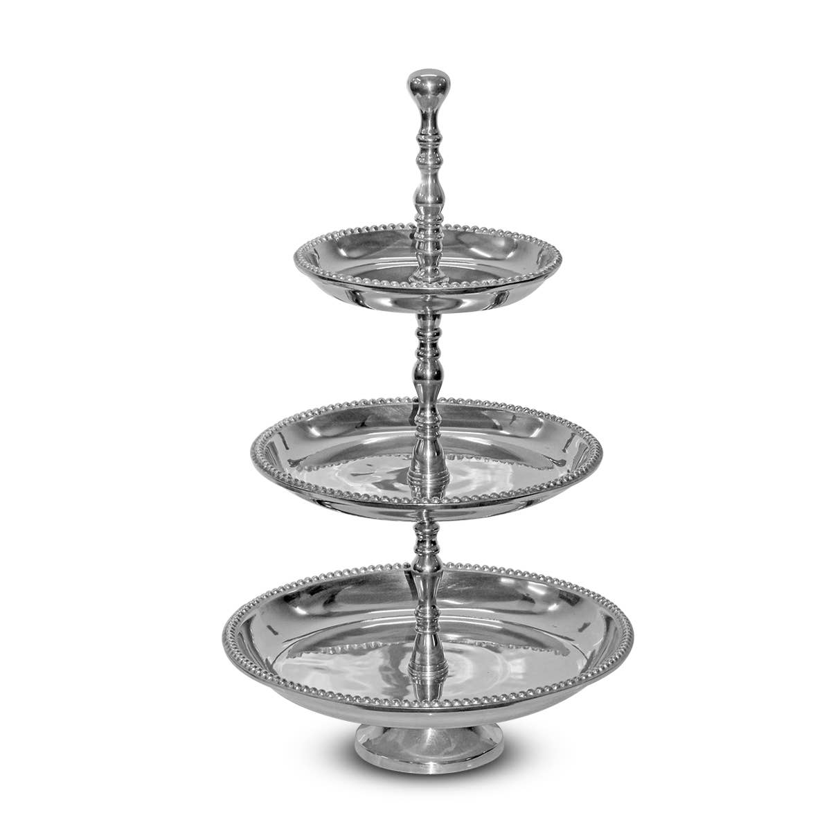 The Beaded Basic 3-Tier Stand is a versatile and stylish addition to any home. This serverware piece is perfect for displaying and serving a variety of items, from appetizers to desserts. Made from durable aluminum, this stand is built to last and can withstand the demands of everyday use. The silver color adds a touch of elegance to any table setting, while the textured surface adds visual interest and prevents items from slipping. Whether you're hosting a dinner party or simply want to elevate your everyday dining experience, the Beaded Basic 3-Tier Stand is a must-have accessory.