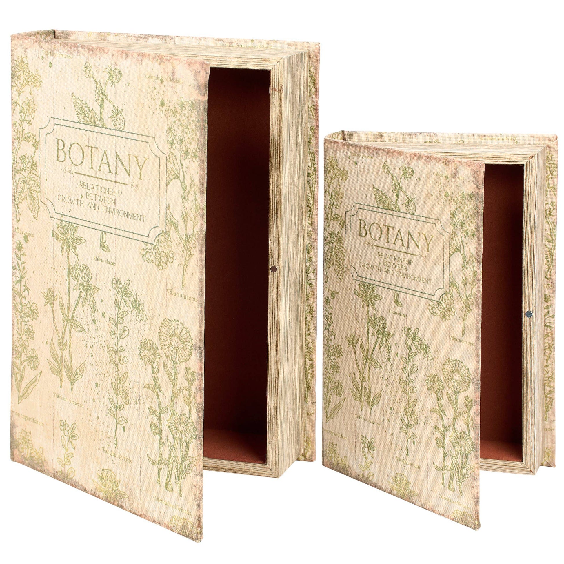 A set of 2 decorative boxes from our Botanical Collection displaying coordinating book designs in different sizes inspired by botanical home décor. Book boxes feature a textured linen wrap displaying the exterior of a vintage book with distressed details and plant study themed pattern as well as a title that reads "Botany - Relationship Between Growth And Environment." Botanical book boxes also display coordinating plant designs and book title on the side to give the appearance of a book spine when on a shelf. Front covers open to reveal a velvet lined space for storing items with a magnet closure for secure storage when standing up. Our Botany book box set can be used upright on a bookshelf or laid flat with the cover open displaying decorative accents inside. Accessories pictured not included. A vintage set of home accents perfect for storing keepsakes in style or for botanical décor displays.