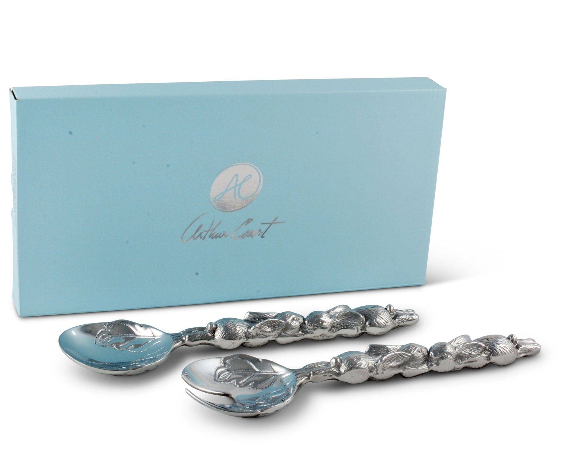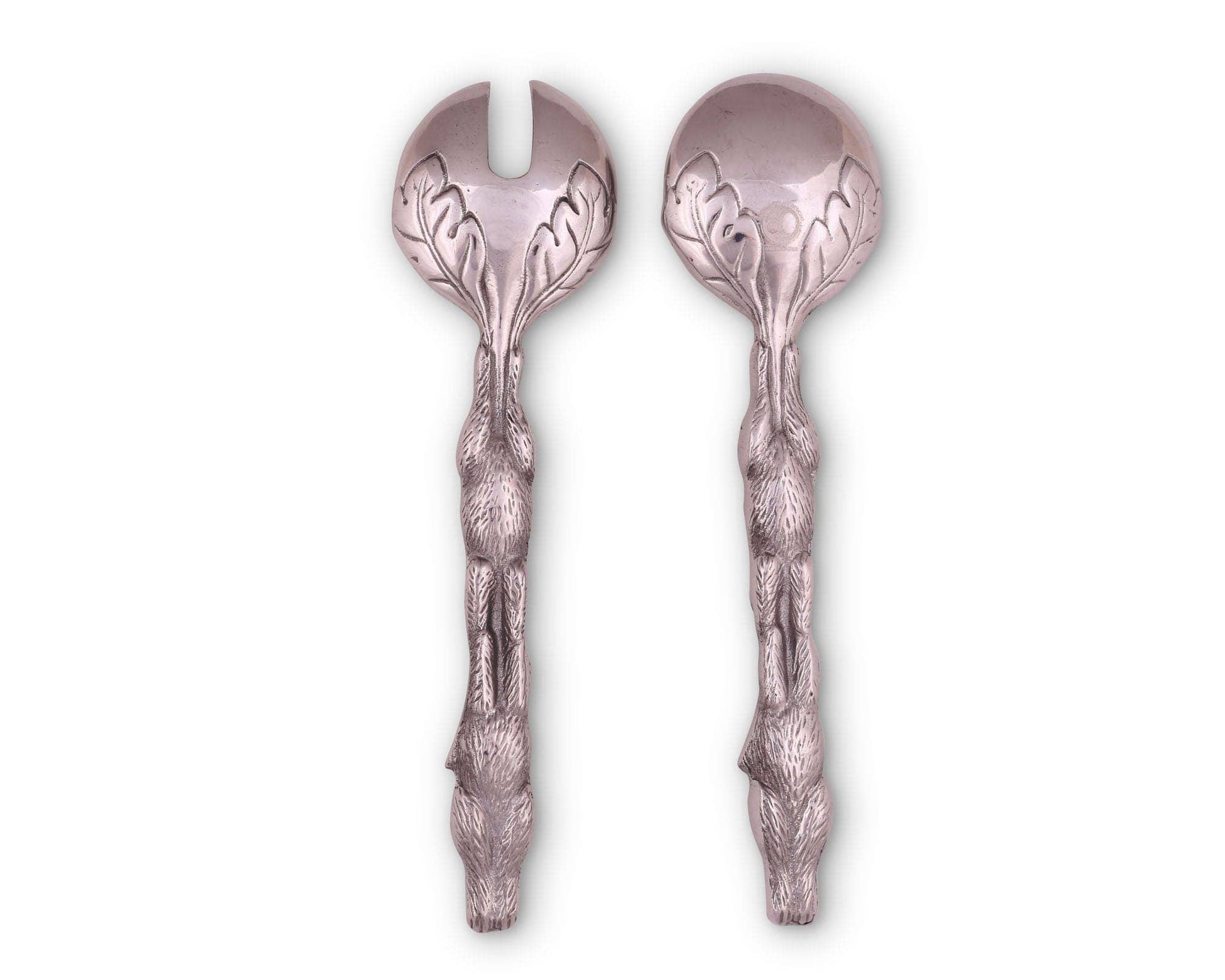 Both pieces feature matching rabbits stretching from the handle and neck to meet in the middle for a friendly touch. Detailed leaves also display in both bowls to complete this handmade, aluminum design.