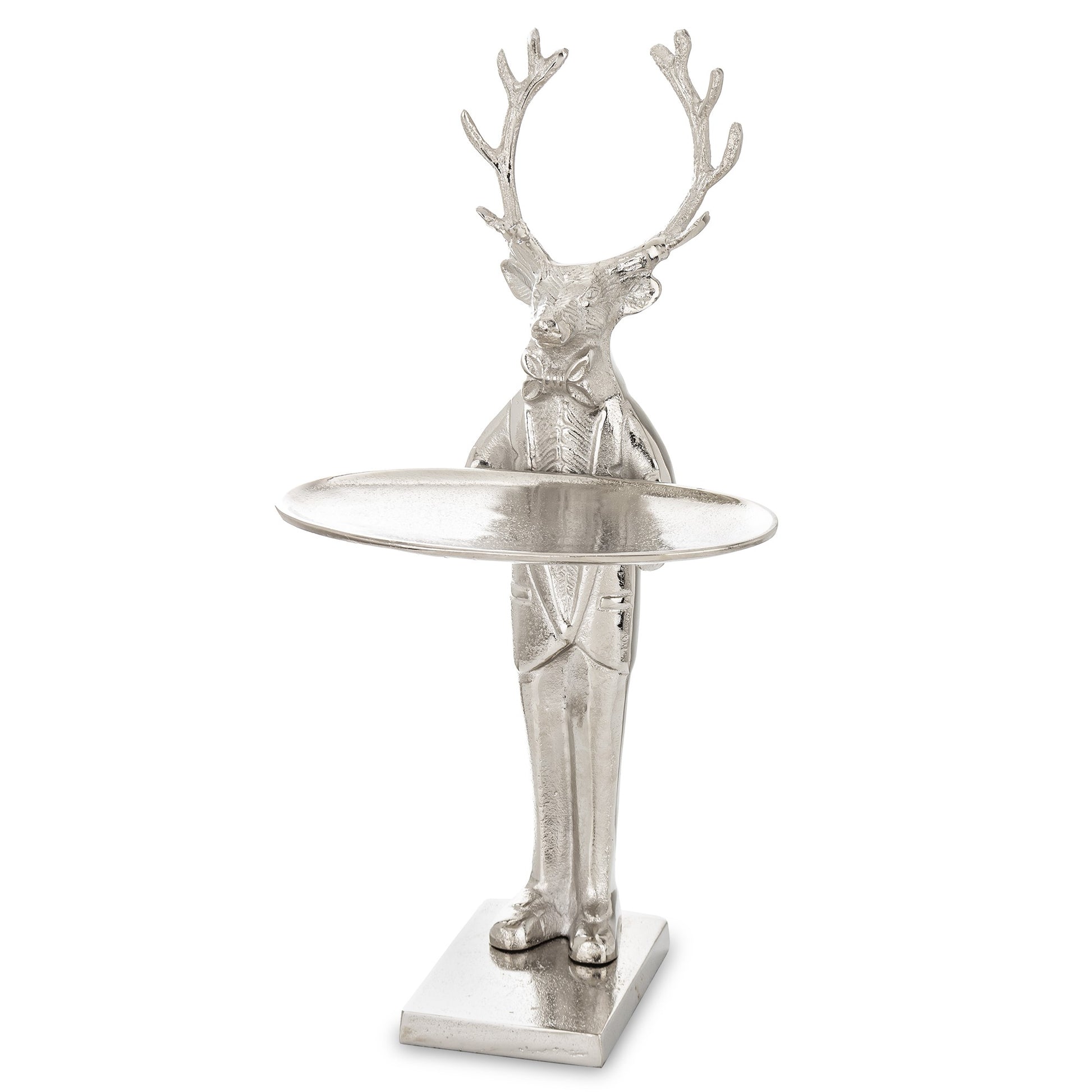 This silver-tone metal stand featuring Mr. Stag, a trusty butler, is as practical as beautiful. With a tasteful silver finish and a bowl to display treats or use as a catchall. This piece is an instant classic with tons of personality