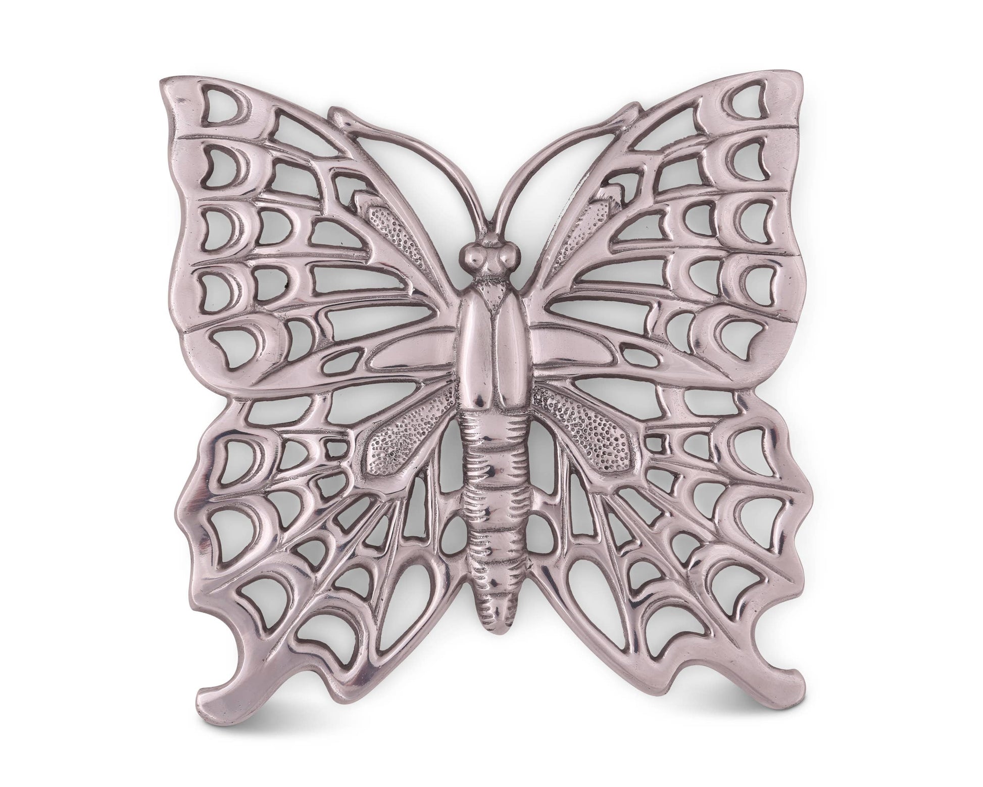 Set the table early to show off the unique design of this Butterfly Trivet from Arthur Court. Openwork patterns highlight the detailed lines and shapes within the butterfly's wings. Handcrafted in sand-cast aluminum, the piece also displays realistic detail within the insect's body, head and antennae. Size: L: 8.5" / W: 8.0" Care: Wash by hand with mild dish soap and dry immediately - do not put in dishwasher.