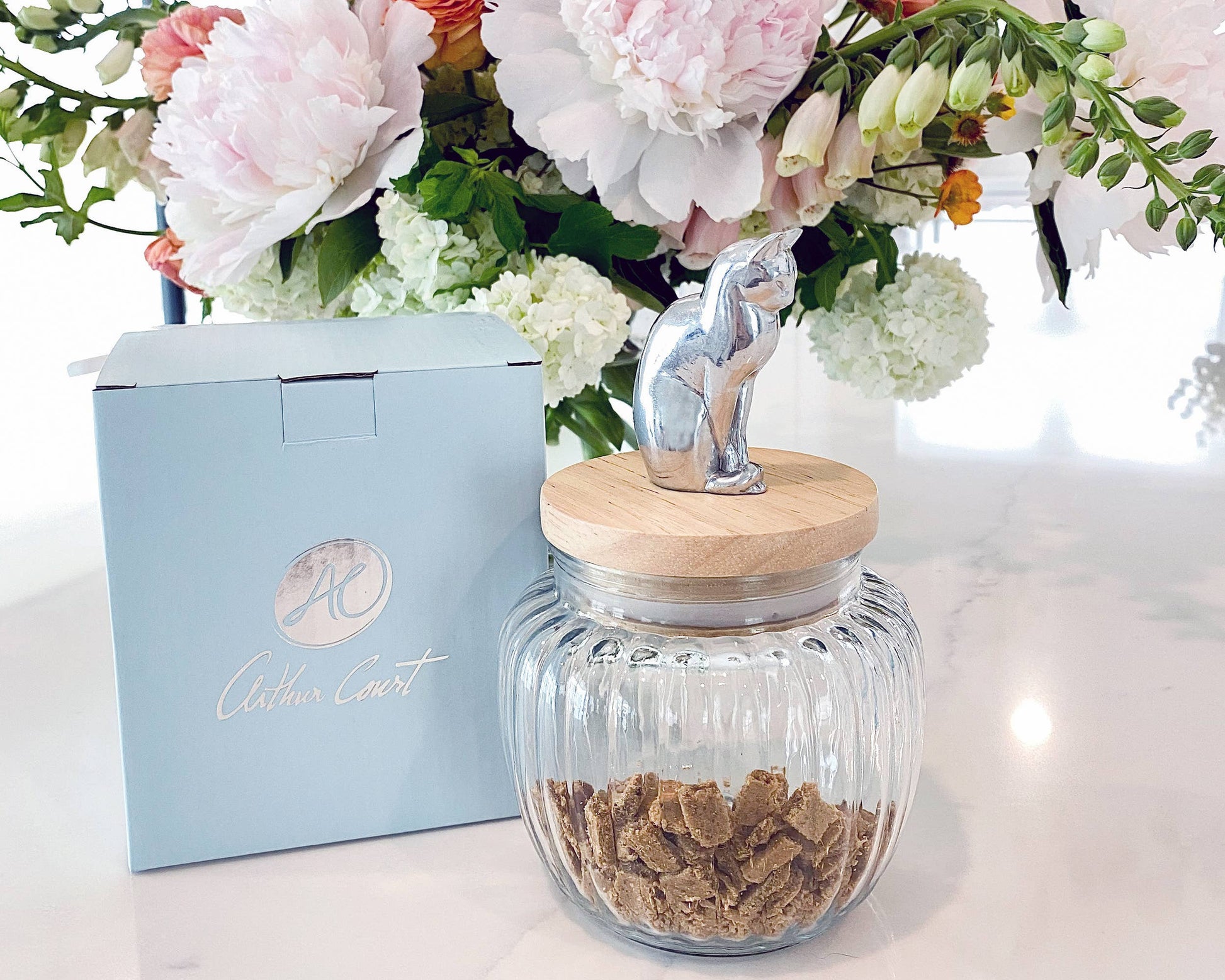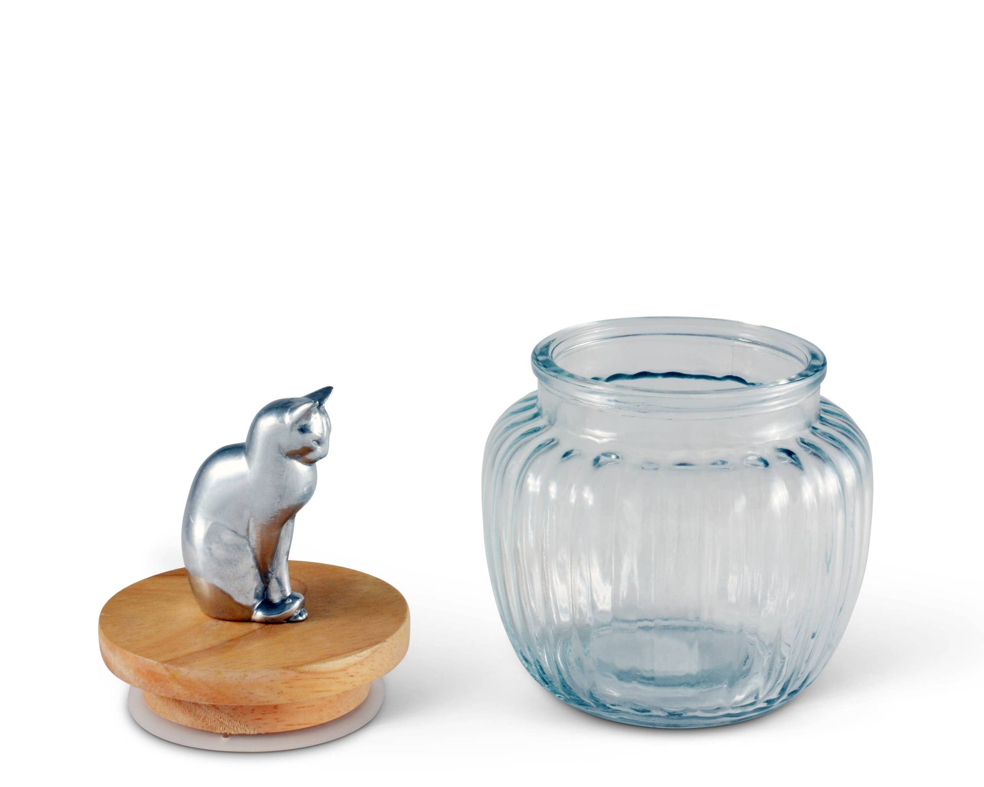 Lovely glass jar is topped with an environmentally sustainable Acacia wood lid. Detailed metal art in aluminum, a sweet kitty waiting for a treat, tops the jar. A premium silicone sealing ring with an air tight seal maintains perfect environment for keeping feline treats the freshest Size: 4.25"W x 7"T 22 Ounces Care: Jars are dishwasher, microwave (without lid), and refrigerator safe.