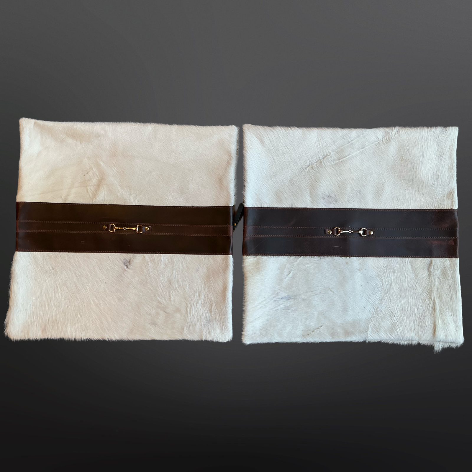 Beautiful Cowhide pillows feature double banded leather with a snaffle bit in the center. These pillows are made with Newmarket leather on the front and genuine cowhide. Subtle and stunning at the same time. 18” square with solid leather backing. Rear center zip closure. These will last a lifetime. Available in two colors: -Solid White/Ivory Cowhide -Assorted Cowhide Colors (this would include blacks, whites, browns, tri-colors and brindles) If you need a particular color please let us know.