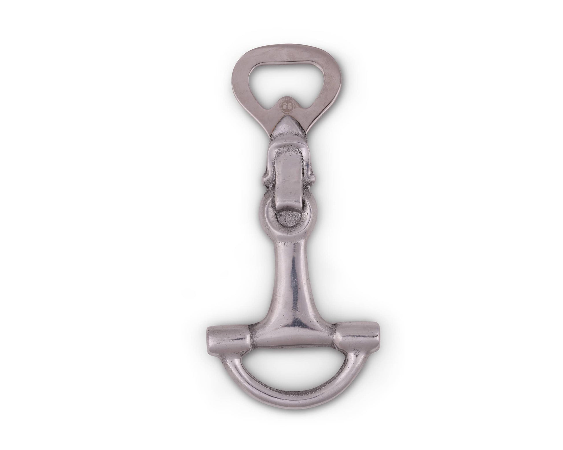 Saddle up and enliven your bar decor with the two-bit bottle opener from the Equestrian Collection by Arthur Court. Sand-cast aluminum is rendered in the shape of a classic Western bridle bit, a perfect addition to the horse-lover's rustic kitchen decor. The opener tip is made from stainless steel, firmly welded into place on the bit handle making the opener extremely durable, ideal for opening even the toughest caps. This bottle opener is crafted from a designer aluminum alloy, fully compliant with FDA regulations for food-safe materials, as is the stainless lever. To clean your bottle opener, wash with gentle soap and warm water, then dry immediately.