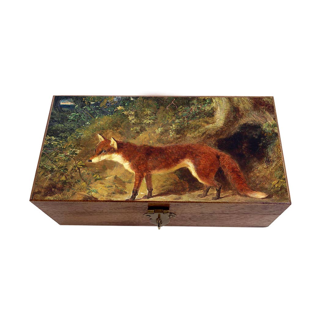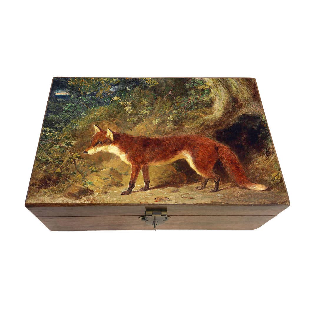 The antique reproduction box features distressed wood, carefully stained and sealed with beeswax for an aged appearance. Adorned with antiqued brass hinges and a secure lid clasp, the box’s lid is printed with a reproduction of original artwork, making it perfect for storing small treasures or serving as a charming tabletop décor piece.