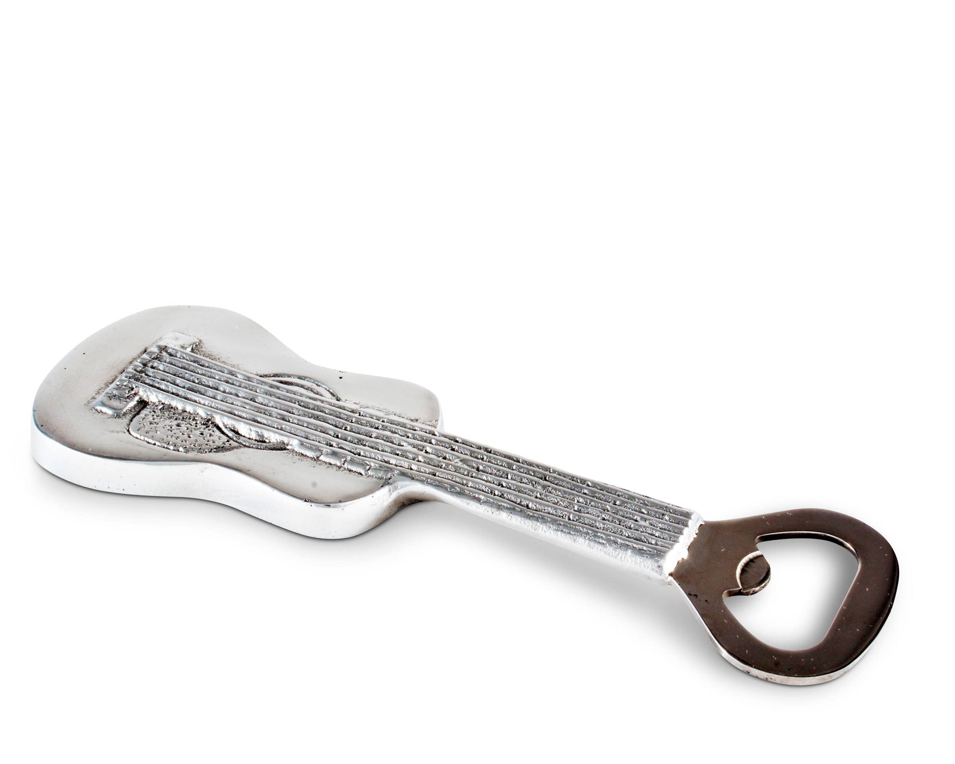 Add a touch of rock-and-roll style to your bar by opening beverages with this guitar bottle opener by Arthur Court. Designed with long-term durability in mind, this unique tool boasts an attractive hand-polished aluminum build, which imbues a silvery luster that showcases every fine detail of this quality piece. Equally well-suited for gifting to your favorite musician or fan and squirreling away for personal use on special occasions, this 2-inch x 6-inch bottle opener comes in a gift box for easy wrapping or storage when not in use. When this tool needs a quick refresh, just hand wash it with mild dish soap and dry it off immediately to ensure it retains its beauty and brilliance for years to come.