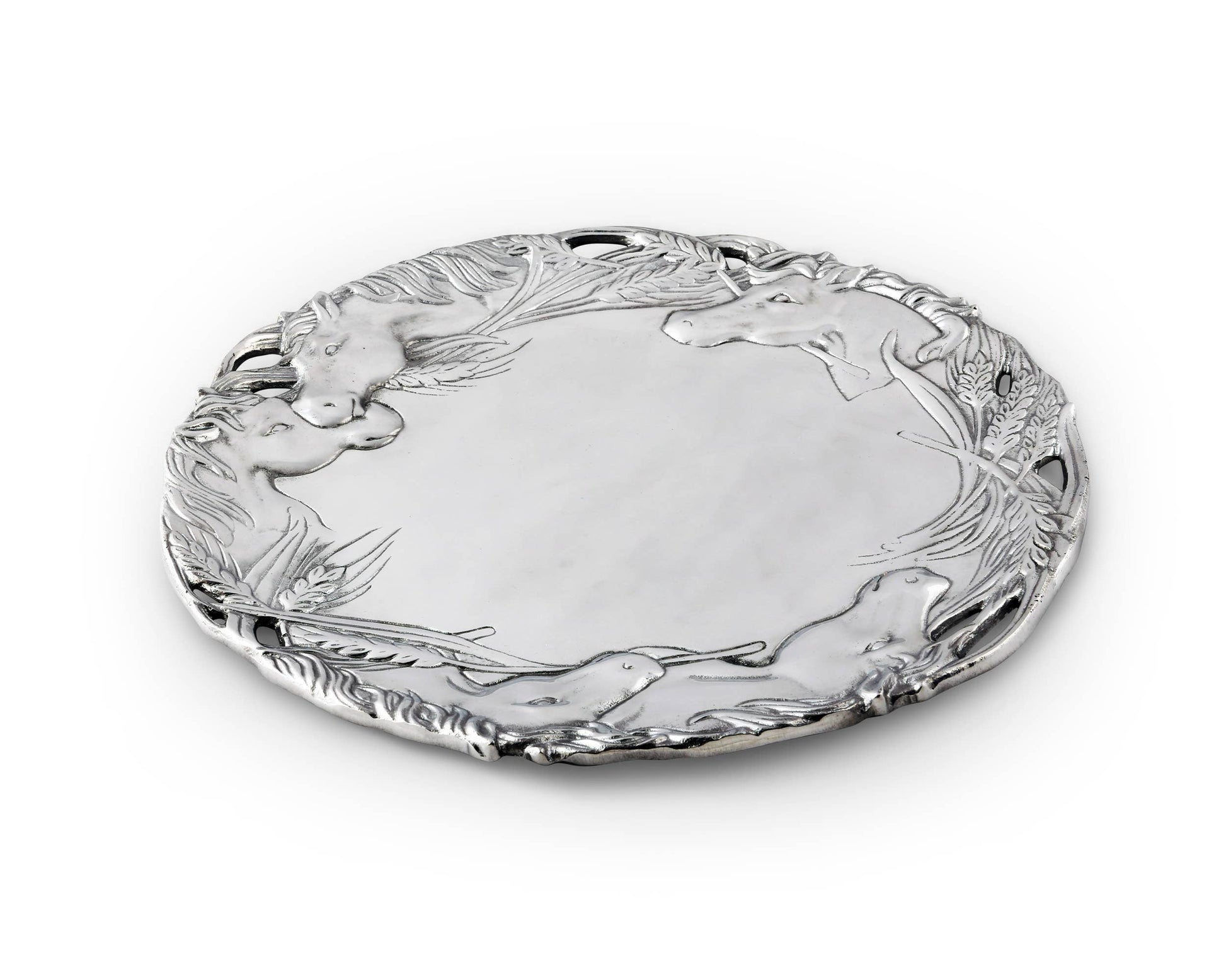 Escape into the world of these beautiful creatures with this 12" Horse Round Tray from Arthur Court. Some stallions nuzzle their faces together as others perk up in the presence of food in this intricately-detailed design. Incredible definition in the heads of wheat make the pieces seem like they're on top of this handmade, aluminum tray, not in it. Size: Diameter: 12.0" Care: Wash by hand with mild dish soap and dry immediately - do not put in dishwasher.