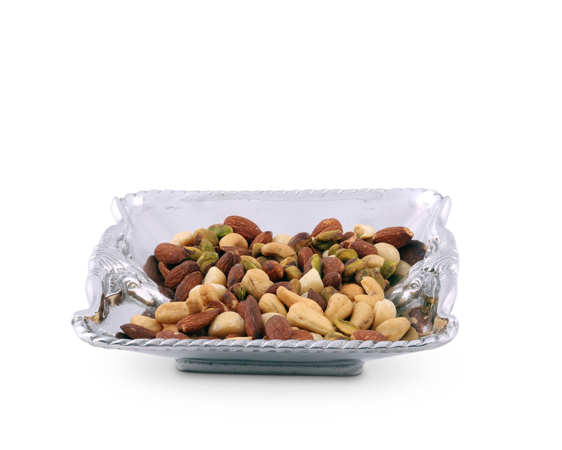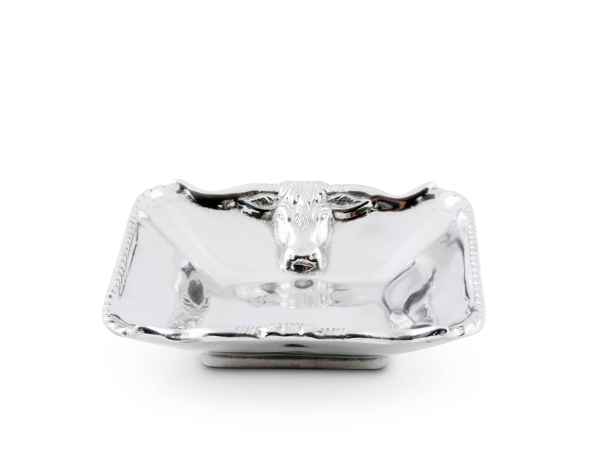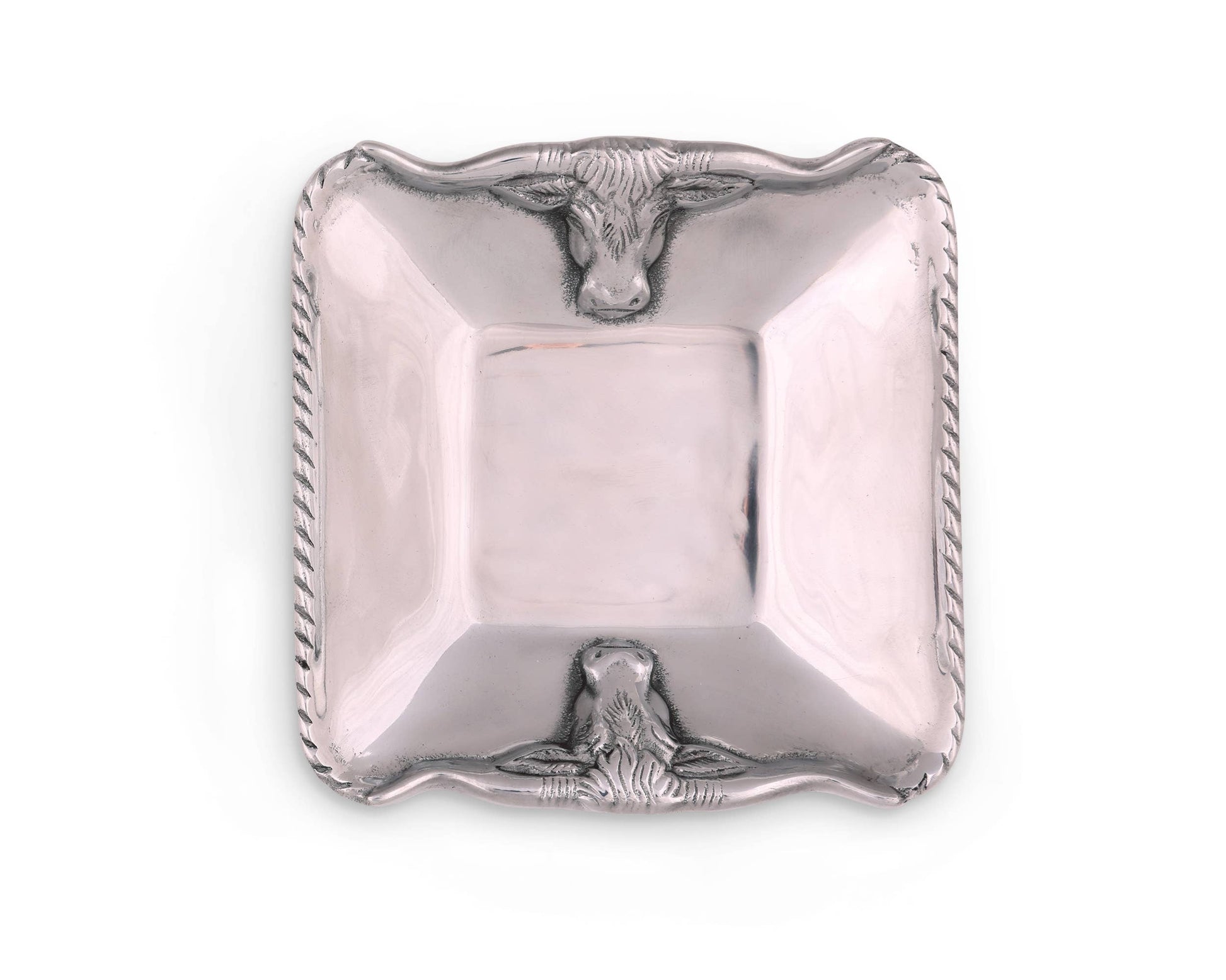 Fashion your serveware collection around the recognizable fixtures in this 6 1/2" Longhorn Bowl from Arthur Court. Intense steers face each other as two sides of this sand-cast piece take on the form of their horns. The extended U-shape of these features interrupts the ropy pattern that borders the edge of this handmade, aluminum bowl. Size: 6-1/2" Care: Wash by hand with mild dish soap and dry immediately - do not put in dishwasher.