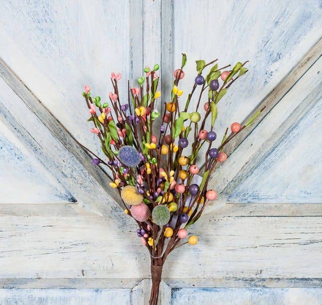 Expertly hand-wrapped for a touch of artistry, this mixed berry pick offers versatile styling options. Whether used on its own or incorporated into arrangements, the lively mix of spring colors adds a playful and festive touch to any space.