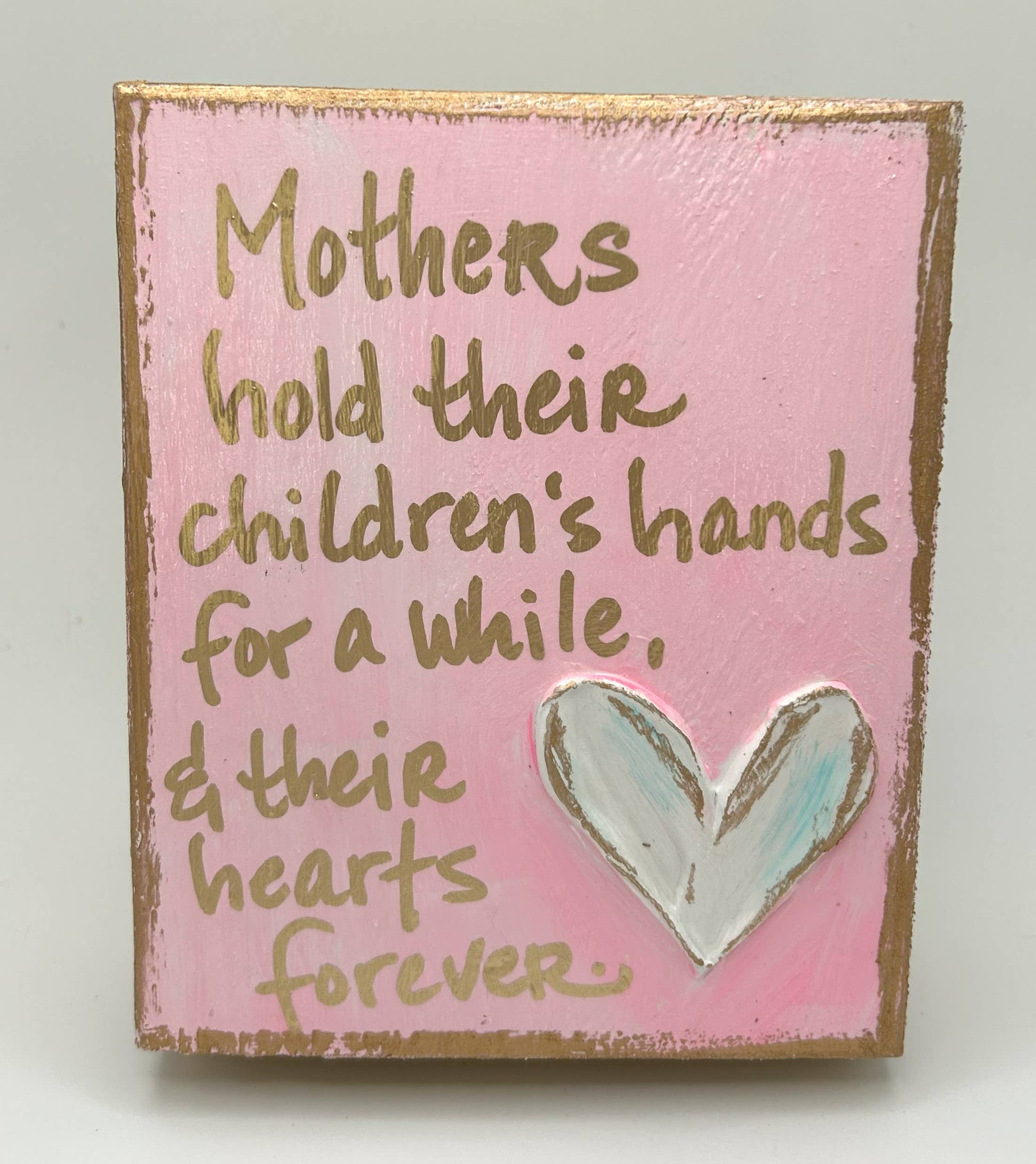 These sweet blocks express just the right message to that special mom on Mother's Day. They pair perfectly with photos, fresh flowers, and cards for her favorite outing to make her day extra special. Blocks are thick and self-standing with gold edges, embellishments, and lettering. Designs are textured and hand painted with an overlay of pearl shimmer and gold trim. Block size is approximately 3x5 inches. Artist signature and company name are included on the back. Because each design is individually drawn and textured, each block is unique and will vary slightly.