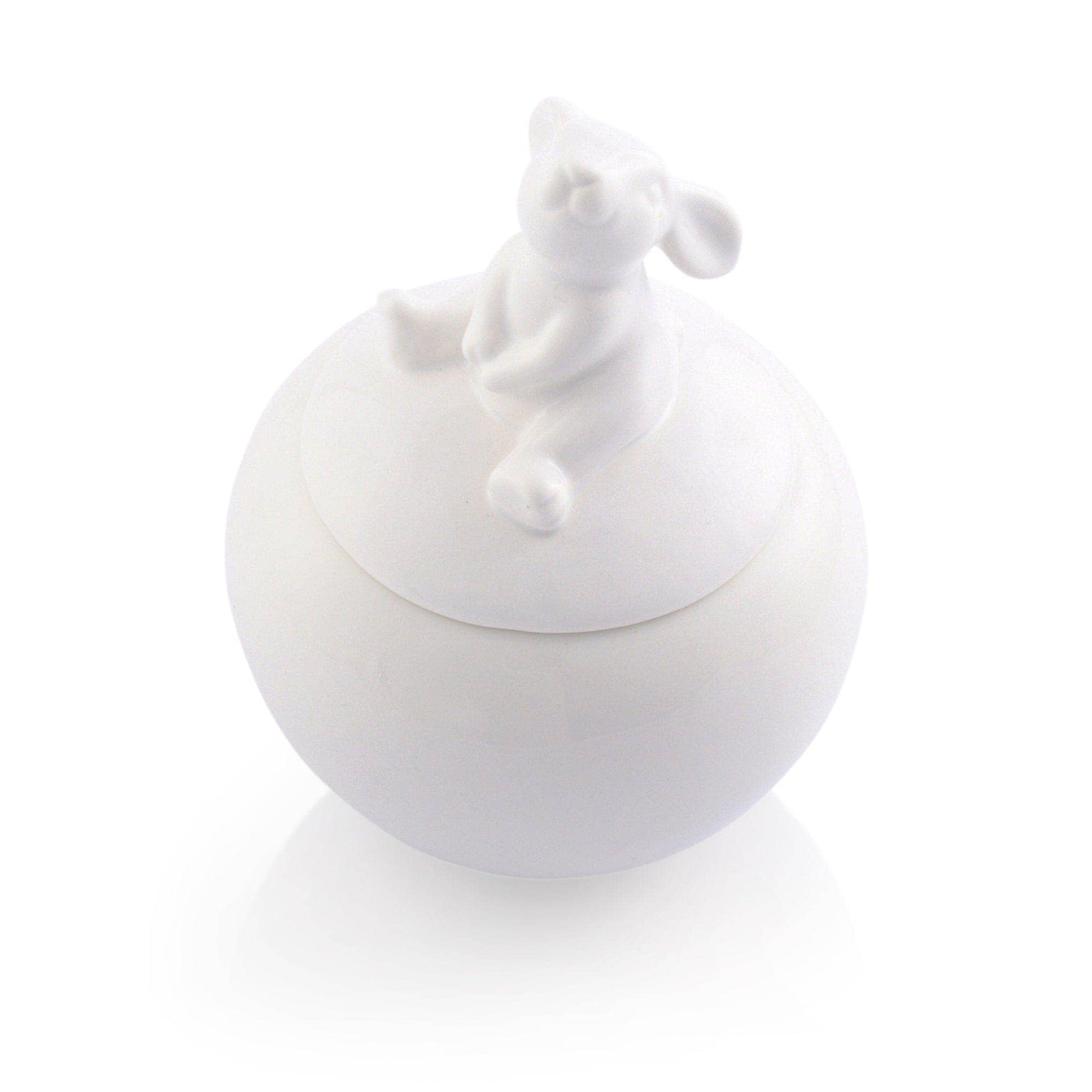 Introducing our charming White Stoneware Setting Bunny Sugar Bowl, an elegant and whimsical addition to your dining table or kitchen countertop. This delightful sugar bowl adds a touch of playfulness to your tea or coffee time, making it an eye-catching and practical accessory for your home. Crafted from high-quality white stoneware, the sugar bowl is durable, easy to clean, and features a smooth, glossy finish. The crisp, clean white color of the stoneware complements a variety of table settings, seamlessly blending in with your existing décor. The star of the show is the adorable setting bunny that sits atop the lid of the sugar bowl, acting as a handle for easy access.