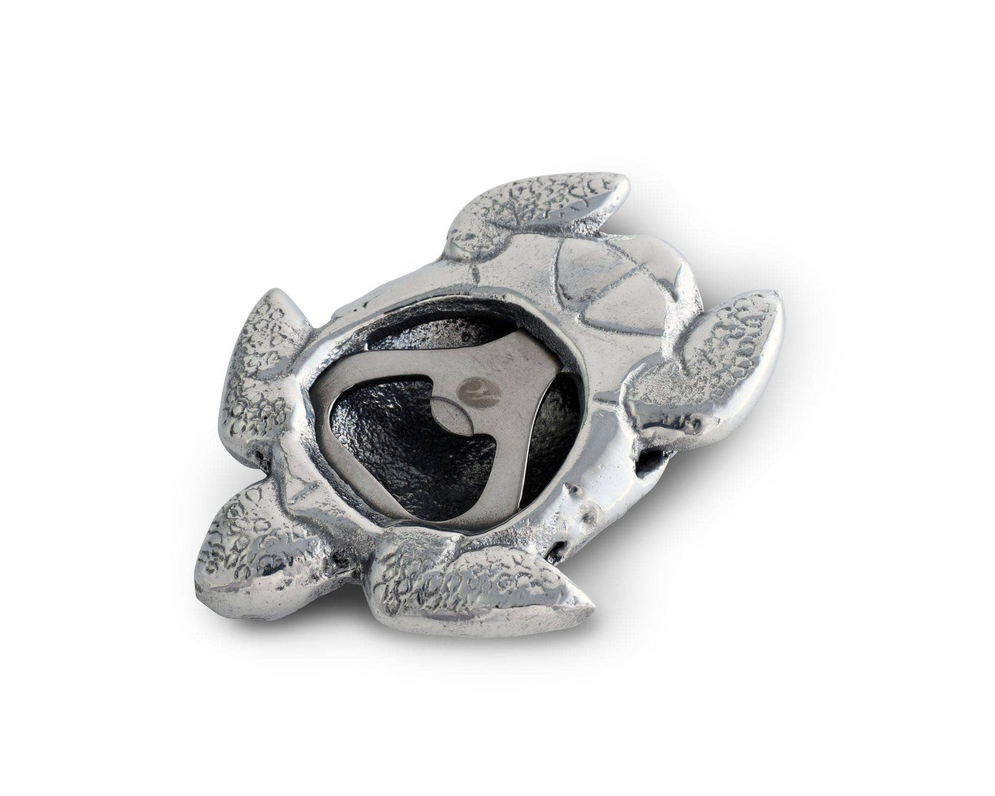Female sea turtles only come ashore to prepare for the next generation, but you can land this adorable sea turtle bottle opener on your counter anytime. This 4 x3-inch Arthur Court bar tool harbors a surprise, a sturdy bottle opener tucked away in her tummy. When this useful sea creature isn't helping landlubbers access capped beverages quickly, it doubles as a conversation piece at your wet bar or food prep area. Handcrafted from sand-cast aluminum, this silver bottle opener adds eye-catching shine to enhance nautically themed displays, and its lifelike shell and leathery limbs enhance its appeal as a decorative piece. In the wild, sea turtles travel up to 10,000 miles a year, and this portable Arthur Court bottle opener is compact enough to take along on your own seaside excursions.
