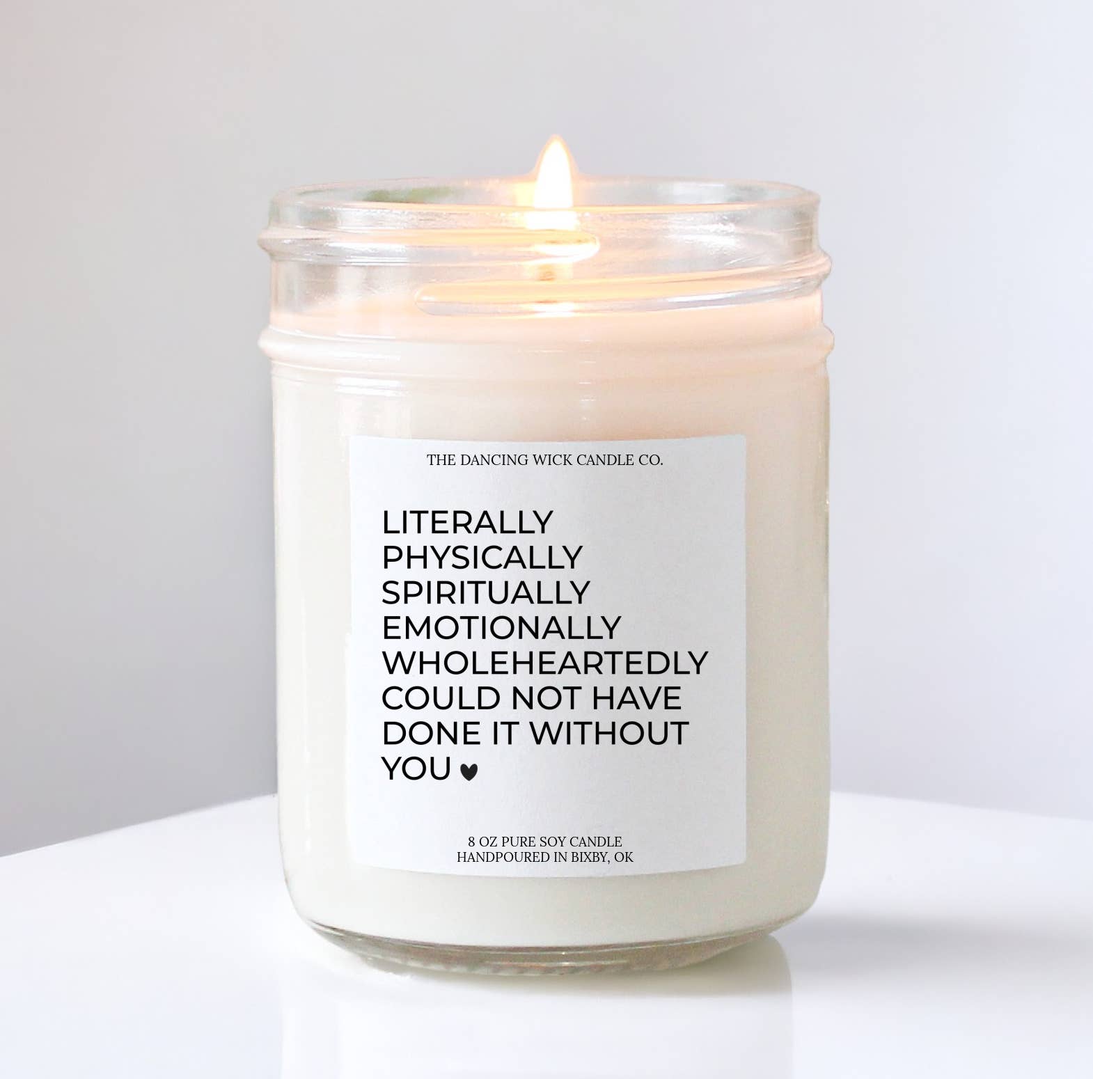 Introducing our "Literally Could Not Have Done It Without You" candle. This hand-poured candle, made with love in Bixby, OK, is the perfect way to show your appreciation. With a heartfelt message that reads "LITERALLY PHYSICALLY SPIRITUALLY EMOTIONALLY WHOLEHEARTEDLY COULD NOT HAVE DONE IT WITHOUT YOU," this candle makes a thoughtful and unique gift for anyone who has made a difference in your life. Personalize it with your own note to make it even more special. Whether you're thanking a friend, family member, or colleague, this candle is sure to brighten their day and warm their heart.